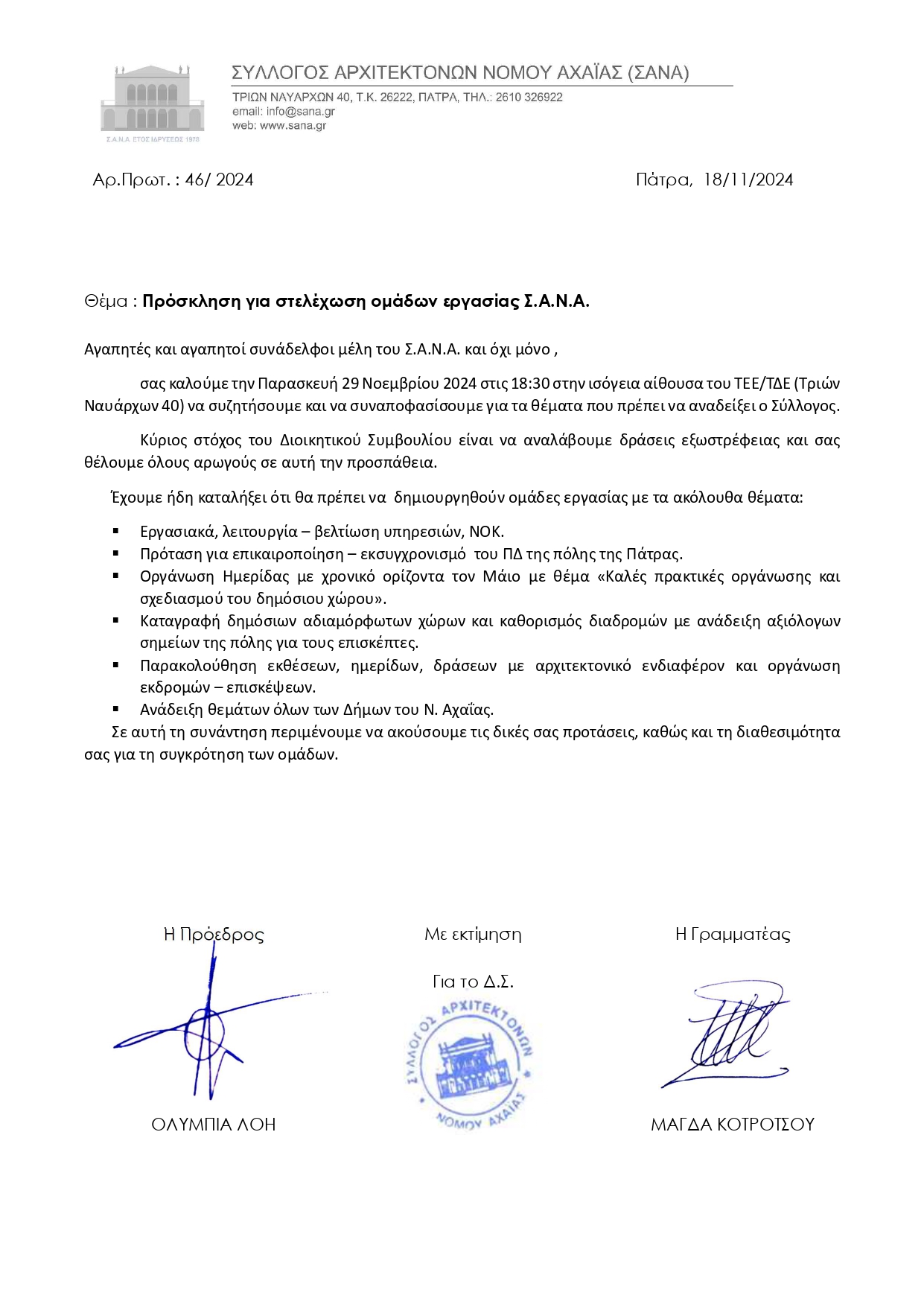 Πρόσκληση για στελέχωση ομάδων εργασίας Σ.Α.Ν.Α.
