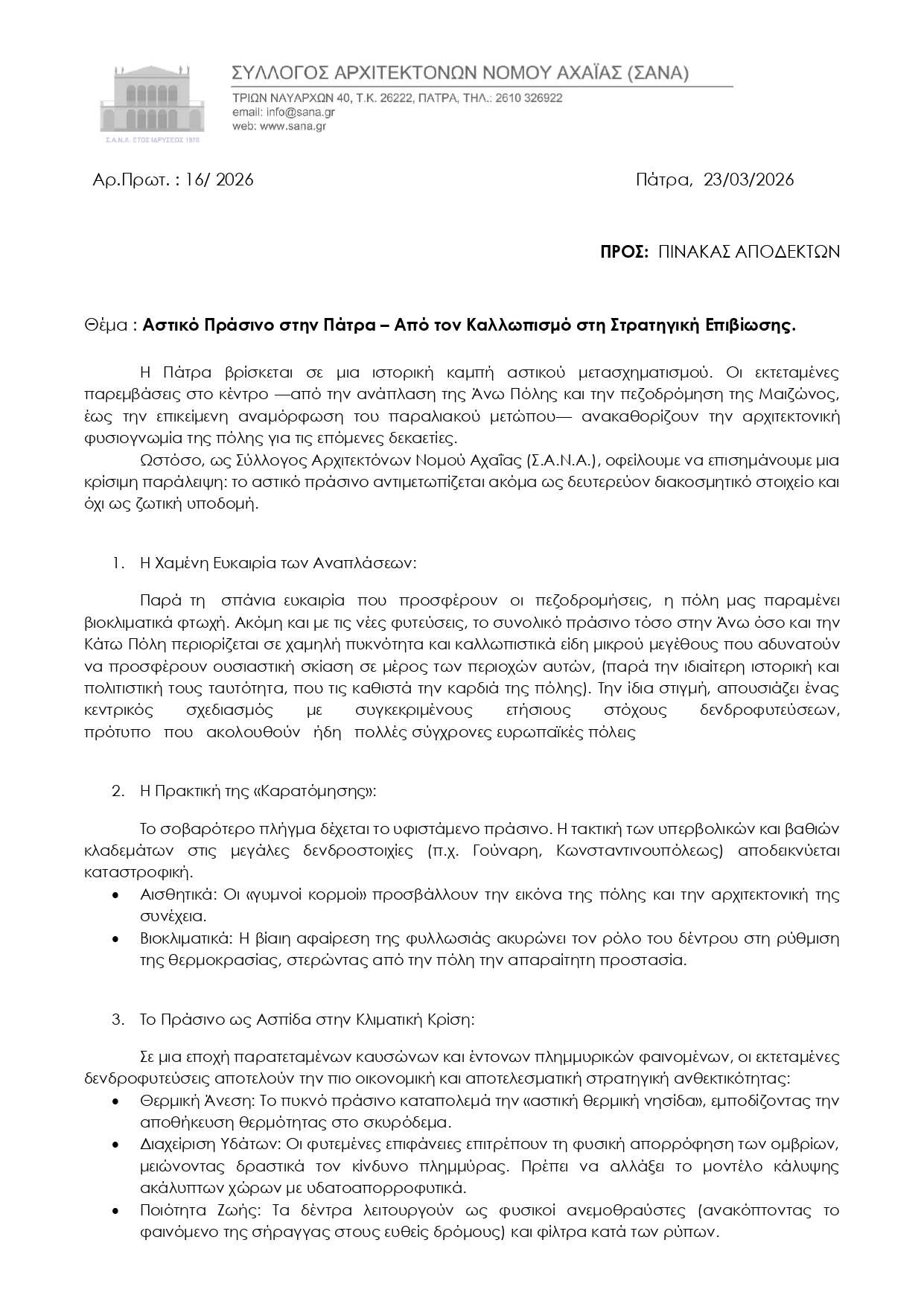 ΔΕΛΤΙΟ ΤΥΠΟΥ: Αστικό Πράσινο στην Πάτρα – Από τον Καλλωπισμό στη Στρατηγική Επιβίωσης.